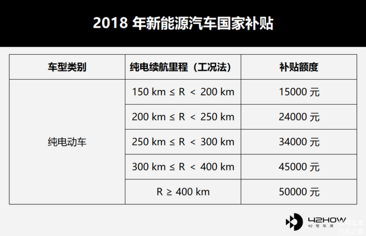 2018 年相較于 2017 年,純電動(dòng)車(chē)型的補(bǔ)貼門(mén)檻由 100 km 上漲到了 150 km,并且將 2017 年補(bǔ)貼標(biāo)準(zhǔn)中的 ≥ 250 km 一個(gè)標(biāo)準(zhǔn)細(xì)分成了 250 到 300,300 到 400 和 ≥ 400 km。