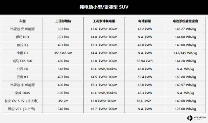 近些年國(guó)內(nèi)高速增長(zhǎng)的 SUV 市場(chǎng)使得純電動(dòng)小型和緊湊型 SUV 成為了最為火爆的新能源戰(zhàn)場(chǎng)。除了傳統(tǒng)車(chē)企在此布置多款產(chǎn)品外,造車(chē)新勢(shì)力們也很喜歡在此“扎堆”,小鵬、哪吒、威馬的首款產(chǎn)品均在此范疇。這一級(jí)別的電池系統(tǒng)能量密度基本都在 140Wh/kg 以上,只有還未上市的合資自主品牌產(chǎn)品——廣本理念 VE1 落在后頭。