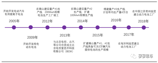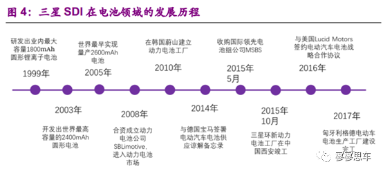 三星SDI創(chuàng)立于1970年,于1999年成功研發(fā)出行業(yè)內(nèi)最大容量的1800mAh圓形鋰離子電池,自此開始進(jìn)入鋰電池領(lǐng)域。2008年,三星SDI和博世合資成立了動(dòng)力電池公司SBLimotive,進(jìn)入汽車動(dòng)力電池領(lǐng)域;2015年,三星SDI全資收購(gòu)國(guó)際領(lǐng)先的電池公司MSBS,并先后在韓中美歐等地建立了汽車動(dòng)力電池工廠。