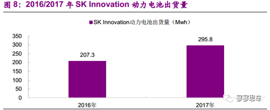 根據(jù)SNE的數(shù)據(jù),SKI動(dòng)力電池的出貨量在2016年為207.3Mwh,在2017年為295.8Mwh,2017年增速達(dá)到42.7%。
