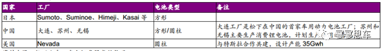日本:生產(chǎn)動(dòng)力電池的工廠包括Sumoto、Suminoe、Himeji、Kasai等,以方形電池為主。