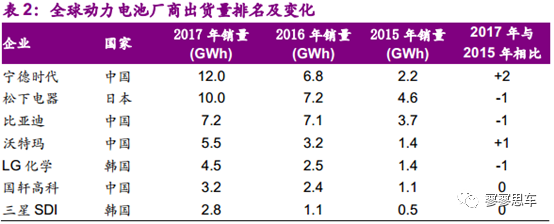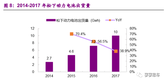 數(shù)據(jù)顯示,2015/2016/2017年,松下動(dòng)力電池出貨量分別為4.6/7.2/10Gwh,分別同比增長(zhǎng)70.4%/56.5%/38.9%。從全球出貨量排名來看,2015年、2016年均為全球第一,但2017年被寧德時(shí)代超越。