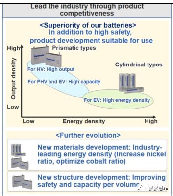 松下動(dòng)力電池包括方形和圓柱兩種,其中方形主要配套HV/PHV車型,圓柱配套BEV車型,主要供給特斯拉,Model S和Model X使用18650圓柱,正極采用NCA材料,單體能量密度可達(dá)250Wh/kg,Model3使用的21700圓柱電池單體能量密度提高到340Wh/kg。對(duì)于HV/PHV車型,主要向高輸出功率/高容量進(jìn)行突破,對(duì)于BEV車型,則向高能量密度進(jìn)行突破。