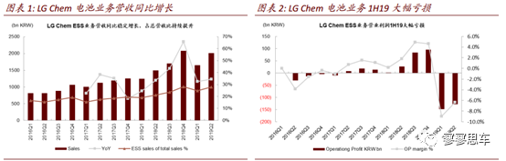 動(dòng)力電池業(yè)務(wù)新產(chǎn)能帶來成本顯著增長(zhǎng),儲(chǔ)能業(yè)務(wù)韓國(guó)火災(zāi)事件損失影響持續(xù)。LGChem2Q19電池業(yè)務(wù)(ESS)營(yíng)收2萬億韓元,同增34%,但營(yíng)業(yè)利潤(rùn)虧損1280億韓元,環(huán)比有所收窄,但1H19已累計(jì)虧損2760億韓元,超過17-18年?duì)I業(yè)利潤(rùn)盈利的總和。對(duì)應(yīng)營(yíng)業(yè)利潤(rùn)率也自2016年以來,連續(xù)兩個(gè)季度低于-6%。公司認(rèn)為主要的虧損原因在于: