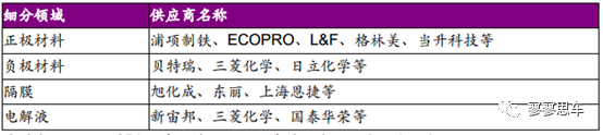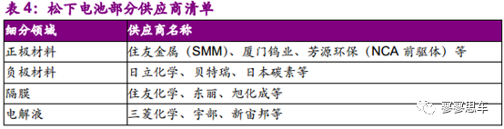 松下的供應(yīng)商大多為中日韓龍頭企業(yè)。其中:(1)正極材料供應(yīng)商包括住友金屬等;(2)負(fù)極材料供應(yīng)商包括日立化學(xué)等;(3)隔膜供應(yīng)商包括住友、東麗等;(4)電解液供應(yīng)商包括三菱化學(xué)、宇部等。