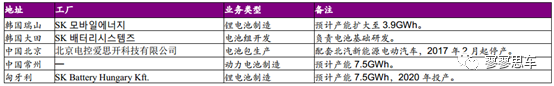 中國(guó):2013年,SKI與北京電控和北汽集團(tuán)合資成立的BESK,在北京亦莊建有電池包生產(chǎn)工廠,2017年,由于一直未能進(jìn)入動(dòng)力電池目錄、訂單減少,SKI宣布在華合資工廠停產(chǎn)。2018年8月,SKI宣布將在中國(guó)常州建立動(dòng)力電池廠,預(yù)計(jì)年產(chǎn)能達(dá)7.5GWh。2018年10月,SKI宣布將在常州投資約25億人民幣,新建產(chǎn)能為鋰離子電池隔膜3.4億㎡、陶瓷涂層隔膜1.3億㎡,新工廠將于2019年初開工建設(shè),計(jì)劃于2020年第三季度投入量產(chǎn)。