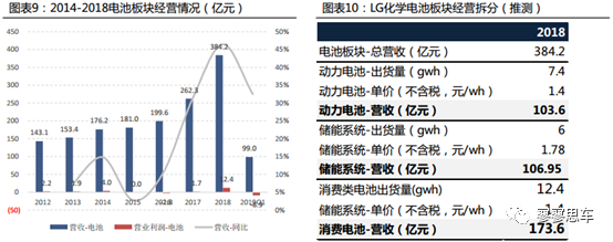 動(dòng)力電池全球四大基地:?jiǎn)螐膭?dòng)力電池來看,LG在全球布局有四個(gè)工廠——中國(guó)南京電池工廠(也生產(chǎn)儲(chǔ)能電池)、韓國(guó)吳倉工廠、美國(guó)霍蘭德工廠、歐洲波蘭工廠,其研發(fā)和工程機(jī)極則靠近各大整車企業(yè),比如美國(guó)密西根、法國(guó)巴黎、德國(guó)法蘭克福、韓國(guó)本部。2018年四大基地子公司營(yíng)收分別為:美國(guó)工廠20億人民幣,波蘭基地29億人民幣;南京動(dòng)力電池基地39億;韓國(guó)現(xiàn)代合資公司25億。此外,南京消費(fèi)電池營(yíng)收190億,合計(jì)6家子公司營(yíng)收300億人民幣,本部電池業(yè)務(wù)估計(jì)營(yíng)收100億。