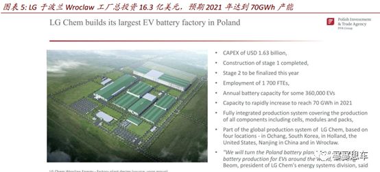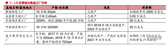 目前LG動(dòng)力電池生產(chǎn)基地主要有韓國(guó)吳倉、美國(guó)密西根、中國(guó)南京、波蘭。韓國(guó)吳倉工廠5gwh產(chǎn)能主要針對(duì)現(xiàn)代以及機(jī)動(dòng)調(diào)配;中國(guó)南京工廠(2個(gè))規(guī)劃35gwh左右主要針對(duì)中國(guó)市場(chǎng);波蘭工廠追加投資,規(guī)劃產(chǎn)能提升至70gwh,主要針對(duì)歐洲市場(chǎng),鎖定大眾、寶馬等;美國(guó)工廠2gwh針對(duì)通用、福特等美系車。公司計(jì)劃2020年四大基地合計(jì)產(chǎn)能擴(kuò)大到110gwh。