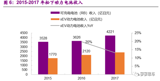 2017年,松下可充電電池(RechargeableBatteries)銷售收入為4221億日元(按2018年7月6日匯率,折合人民幣253億元),我們估算xEV動(dòng)力電池收入約2350-2400億日元(折合人民幣約140億元),同比增速約12%。根據(jù)公司公告,受到圓柱動(dòng)力電池盈利能力較差的影響,2017年Energy細(xì)分領(lǐng)域營(yíng)業(yè)利潤(rùn)為111億日元(折合人民幣6.7億元)。