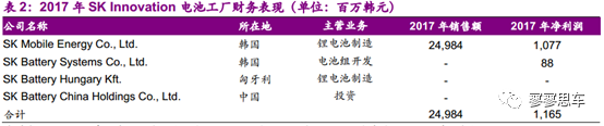 SKI已在韓國(guó)、匈牙利、中國(guó)設(shè)立4家動(dòng)力電池工廠,目前只有韓國(guó)工廠量產(chǎn)動(dòng)力電池,匈牙利和中國(guó)工廠正在建設(shè)中。根據(jù)SKI的公告,2017年位于韓國(guó)的電池制造工廠銷售額為250億韓元(折合人民幣約為1.53億元)。