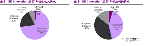 SK Innovation是韓國(guó)首家大型能源、化工企業(yè),其業(yè)務(wù)范圍包括石油開發(fā)及其他業(yè)務(wù)、石油業(yè)務(wù)、化學(xué)業(yè)務(wù)和潤(rùn)滑油業(yè)務(wù)。2017年,SKI的銷售收入為462,609億韓元,同比增長(zhǎng)17.06%,營(yíng)業(yè)利潤(rùn)為32,344億韓元,同比增長(zhǎng)0.19%;其中,勘探與開發(fā)及其他業(yè)務(wù)(E&PandOther Business)/石油業(yè)務(wù)(PetroleumBusiness)/化學(xué)業(yè)務(wù)(ChemicalBusiness)/潤(rùn)滑油業(yè)務(wù)(LubricantBusiness)的銷售收入占比分別為2%/71%/20%/7%,營(yíng)業(yè)利潤(rùn)占比分別為-5%/46%/43%/16%。動(dòng)力電池業(yè)務(wù)歸屬于勘探與開發(fā)及其他業(yè)務(wù)板塊。