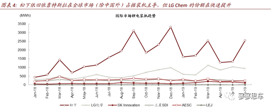 特斯拉業(yè)務(wù)增長(zhǎng)受阻新客戶拓展較慢,海外份額面臨LG Chem的快速追趕。松下在全球新能源車?yán)顺敝惺芤嬗谔厮估尼绕,但同樣因Gigafactory產(chǎn)能的瓶頸增長(zhǎng)受阻。同時(shí)在其它客群上,僅開拓豐田這一核心客戶,在德系及美系車企上均無較好建樹,也無歐洲配套的產(chǎn)能,顯著落后于LG Chem、SKI及寧德時(shí)代。