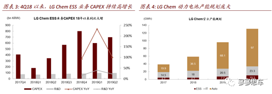 大額且激進(jìn)的CAEPX顯示了LGChem對(duì)于全球新能源車未來高增長(zhǎng)的信心,也反映了背靠持續(xù)盈利的石油化工業(yè)務(wù)下強(qiáng)勁的資金實(shí)力。我們認(rèn)為歐洲新能源車在歐盟碳排的驅(qū)動(dòng)下發(fā)展有望持續(xù)超預(yù)期,帶來需求提前的釋放,有望緩解LGChem2020年后的盈利壓力,但短期持續(xù)增長(zhǎng)的產(chǎn)能帶來的折舊與產(chǎn)能調(diào)試下產(chǎn)能利用率的不穩(wěn)定將在歐洲電池需求進(jìn)入爆發(fā)式增長(zhǎng)期前帶來持續(xù)的盈利壓力。此外,受火災(zāi)事件影響,市場(chǎng)預(yù)期2019年韓國(guó)本土儲(chǔ)能需求將放緩。由于LGChem2H18顯著受益于儲(chǔ)能放量,因此2H19儲(chǔ)能業(yè)務(wù)存在同比增長(zhǎng)的壓力。