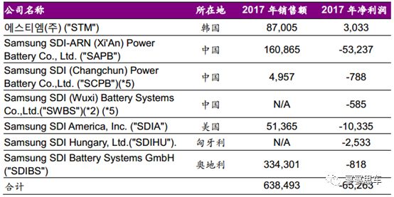 三星SDI已在韓國(guó)、中國(guó)、美國(guó)、匈牙利及奧地利等地布局了汽車動(dòng)力電池的工廠。根據(jù)三星SDI的公告,2017年,韓中美歐四個(gè)地區(qū)的動(dòng)力電池公司銷售收入合計(jì)6,385億韓元(人民幣約40億元),凈利潤(rùn)合計(jì)-652.6億元(人民幣約-4億元)。