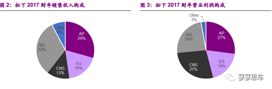 松下的業(yè)務(wù)板塊包括Appliances(AP)、Eco Solutions(ES)、Connected Solutions(CNS)和Automotive & Industrial Systems(AIS)等。2017年(2017年4月1日-2018年3月31日,下同),松下銷售收入為79,822億日元,同比增長(zhǎng)9%,營(yíng)業(yè)利潤(rùn)為3805億日元,同比增長(zhǎng)37%。