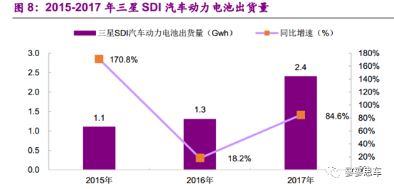 根據(jù)SNE的數(shù)據(jù),2015/2016/2017年,三星SDI汽車動(dòng)力電池出貨量分別為1.1/1.3/2.4Gwh,同比增速分別為170.8%/18.2%/84.6%,在全球出貨量排名中分別排第10/9/5名。