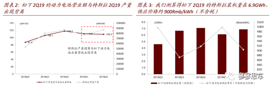 特斯拉2Q放量并未帶動(dòng)松下動(dòng)力電池業(yè)務(wù)增長(zhǎng),我們測(cè)算松下供應(yīng)單價(jià)有所下降。特斯拉2Q19共生產(chǎn)8.7萬輛電動(dòng)車,同比增長(zhǎng)12.9%,其中Model S/X 1.45萬輛,Model37.25萬輛。我們測(cè)算得松下對(duì)特斯拉2Q19對(duì)應(yīng)供應(yīng)量可達(dá)6.9GWh,環(huán)比增長(zhǎng)12.3%,但對(duì)應(yīng)營(yíng)收環(huán)比則下降。從趨勢(shì)上,2Q19特斯拉產(chǎn)量與松下動(dòng)力電池銷量額的趨勢(shì)也出現(xiàn)較為明顯的背離。假設(shè)特斯拉電池占松下動(dòng)力電池銷售額90%,我們測(cè)算得,松下2Q19的電芯供應(yīng)價(jià)格約為904元/kWh,低于1Q19的998元/kWh與FY2019平均的939元/kWh(不含稅)。