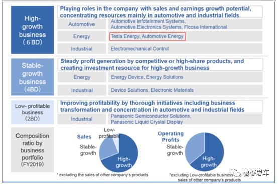 汽車動(dòng)力電池歸屬于松下高速增長(zhǎng)業(yè)務(wù)板塊。松下將公司旗下各業(yè)務(wù)板塊劃分為高速增長(zhǎng)、穩(wěn)定增長(zhǎng)和低盈利業(yè)務(wù),其中高速增長(zhǎng)業(yè)務(wù)包括汽車動(dòng)力電池(含特斯拉)、車載信息系統(tǒng)、汽車電子等;穩(wěn)定增長(zhǎng)業(yè)務(wù)包括能源解決方案、電子材料等;低盈利業(yè)務(wù)包括半導(dǎo)體解決方案等。