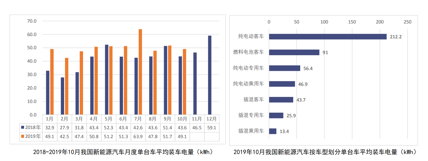 2019年10月,我國(guó)新能源汽車按車型劃分的平均裝車電量49.1kWh,環(huán)比下降5.0%。