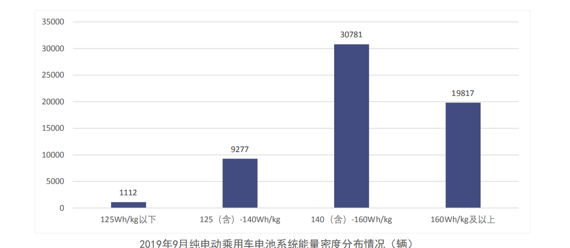 2019年10月,我國(guó)純電動(dòng)乘用車系統(tǒng)能量密度在140(含)-160Wh/Kg以上區(qū)間的車型產(chǎn)量最高,達(dá)3.1萬(wàn)輛,占純電動(dòng)乘用車總產(chǎn)量50.5%;在160Wh/kg及以上和125(含)-140Wh/kg區(qū)間車型產(chǎn)量分別為2.0萬(wàn)輛和0.9萬(wàn)輛,分別占純電動(dòng)乘用車總產(chǎn)量32.5%和15.2%。160Wh/kg以上車型產(chǎn)量占比保持持續(xù)上升趨勢(shì)。