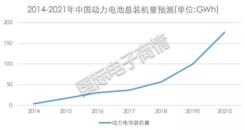 圖3 2014-2021年中國動力電池總裝機量預測 制圖:國際電子商情