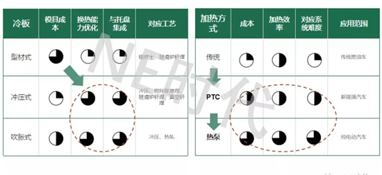 整體來看,未來的熱管理冷卻將以液冷為主,加熱方式前期會以PTC為主,過渡期使用小功率PTC+熱泵的形式,后期以熱泵為主。隨著動力電池Pack的性能和換熱需求的提升,對冷板的各方面要求也將提升,主流產(chǎn)品將由型材式冷板向其他形式過渡,同時對加熱的效率和能耗也相對應(yīng)的提出了更高的要求,PTC和熱泵的選擇將隨著各自的技術(shù)成熟度和成本優(yōu)勢做雙向的博弈。