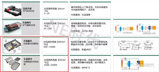 電池加熱、冷卻兩種類型下又包括多種實現(xiàn)方式。常見的電池冷卻方式分為自然冷卻,風(fēng)冷(主動+被動)、主動液冷(板式+獨立回路),主動直冷四種。