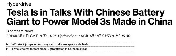 2019年3月,彭博社發(fā)表文章稱(chēng)特斯拉正在與國(guó)內(nèi)動(dòng)力電池巨頭寧德時(shí)代進(jìn)行談判,計(jì)劃采購(gòu)寧德時(shí)代的電池用于上海產(chǎn)的、大家買(mǎi)的起的國(guó)產(chǎn)Model3。
