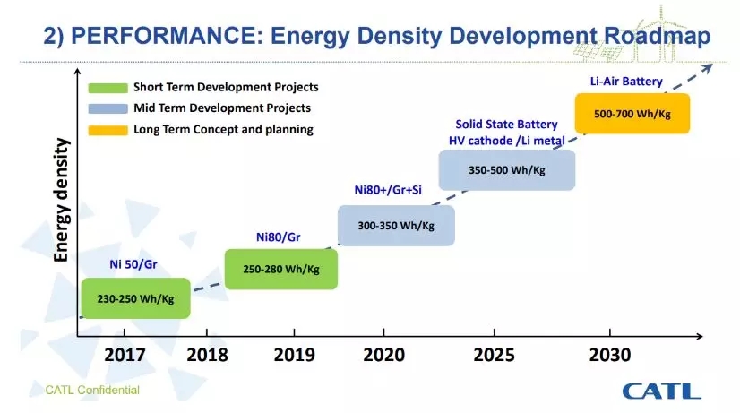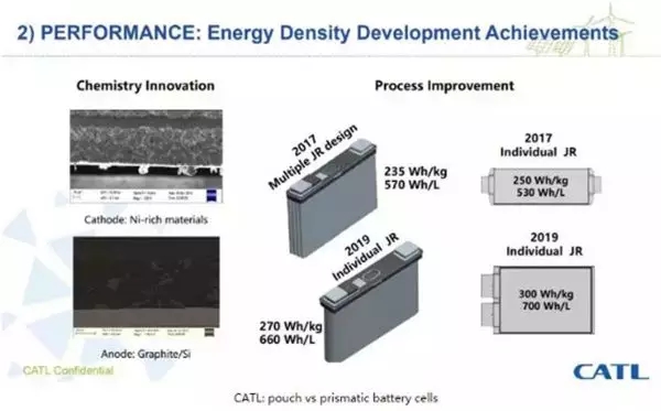 另一張圖片標(biāo)有CATL文字的PPT截圖則顯示CATL的電芯能量密度將從2019年的250-280wh/kg大幅度增加到2020年的300-350wh/kg。
