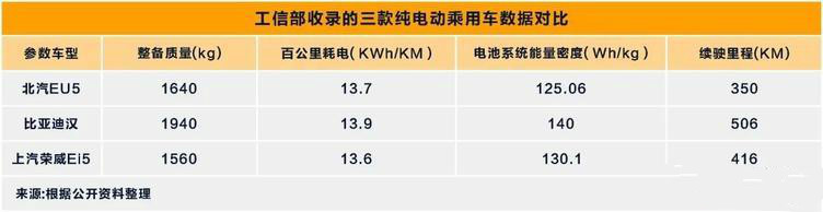 對比工信部收錄的三款乘用車數(shù)據(jù),比亞迪漢的電池系統(tǒng)能量密度最大。