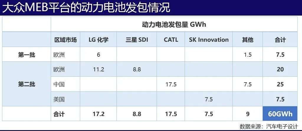 以大眾為例,其MEB平臺(tái)已分四批鎖定了不同的電池供應(yīng)商,前兩批采購(gòu)量是60GWh,供應(yīng)商是清一色的亞洲面孔,寧德時(shí)代拿到了最大的單子。