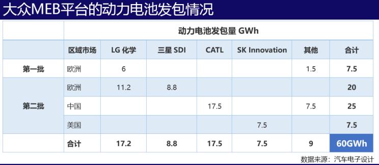 以大眾為例,其MEB平臺(tái)已分四批鎖定了不同的電池供應(yīng)商,前兩批采購(gòu)量是60GWh,供應(yīng)商是清一色的亞洲供應(yīng)商,寧德時(shí)代拿到了最大的單子。