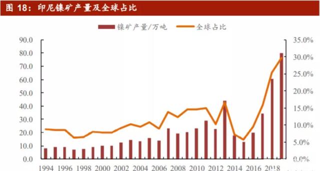 初期,硫化鎳礦產(chǎn)量占全球的主導(dǎo)地位,紅土鎳礦的供給數(shù)量較少,但隨著2007 年以后工業(yè)中發(fā)明了使用鎳鐵替代電解鎳生產(chǎn)不銹鋼的工藝,開采成本低的紅土鎳礦應(yīng)用隨之興起,2019 年紅土鎳礦產(chǎn)量占比擴(kuò)大至64%,且仍在提升,硫化鎳礦占比縮小至了36%。