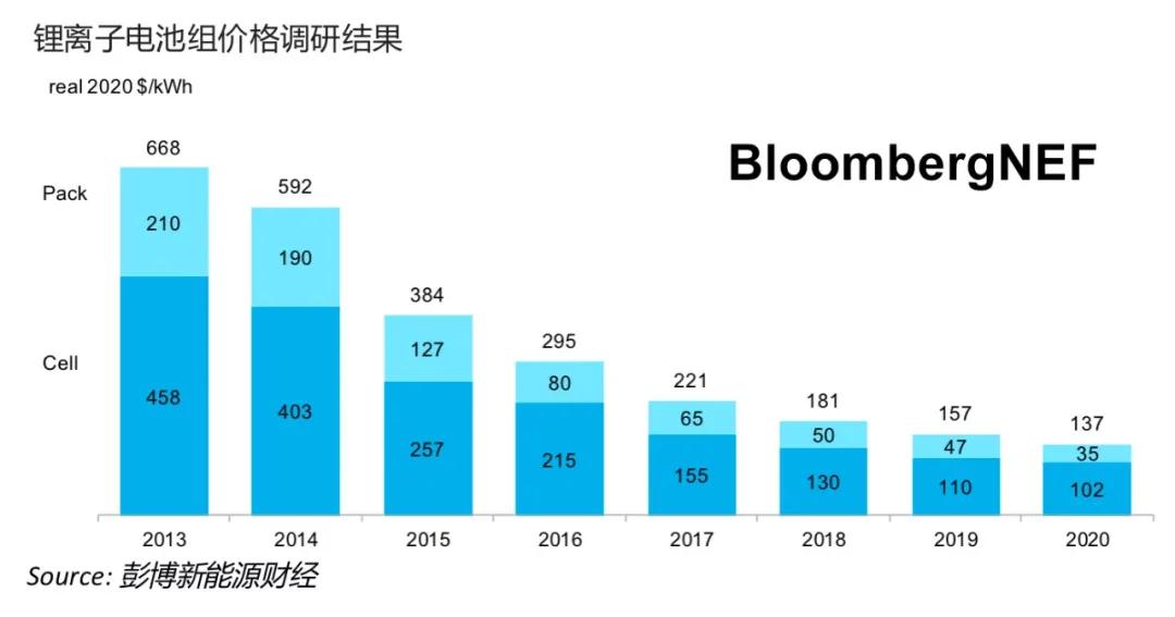 電池組平均價(jià)格從1100美元/千瓦時(shí)降至137美元/千瓦時(shí),降幅達(dá)89%。根據(jù)彭博新能源財(cái)經(jīng)的最新預(yù)測(cè),到2023年,鋰離子