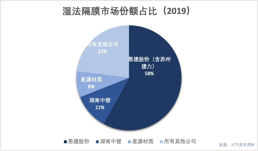 而濕法隔膜的頭部效應更甚,2019年恩捷股份收購蘇州捷力之后與湖南中鋰和星源材質(zhì)兩家公司一同占據(jù)了市場77%的銷售總量,其中,僅龍頭恩捷股份國內(nèi)市場占有率高達58%。