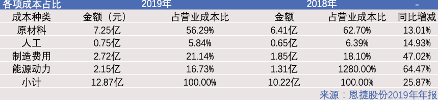上方圖表中我們可以看到,受益于規(guī)模效應,原材料和人工雖然在2019年在絕對數(shù)量上增長了13.01%和14.93%,但是所占營業(yè)成本比卻雙雙下降。與之同時,能源動力的成本也因為生產(chǎn)的擴張急速上升,同比增長64.47%。