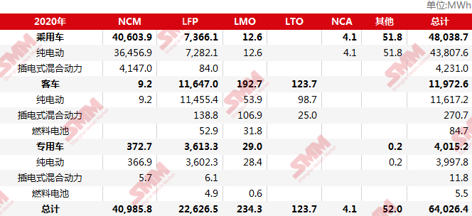 據(jù)SMM新能源數(shù)據(jù)庫顯示,2020年中國動力電池總裝機64GWh,同比增長2.9%。從電池類型來看,三元電池主要應用于乘用車領(lǐng)域,共實現(xiàn)裝機41GWh,占比64%;磷酸鐵鋰電池主要應用于商用車及純電動乘用車中,共裝機22.6GWh,占比35.3%。