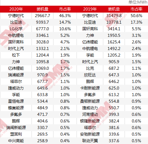 此外中航鋰電通過與廣汽、長安汽車的深度合作,特別是成為暢銷車型廣汽AION S的主要供應商后,裝機量排名大幅提升,裝機量同比增加124.2%。瑞浦能源通過裝配上汽通用五菱爆款車宏光MINI及云度新能源等,裝機量排名擠進前十。比亞迪由于全年營運市場需求減弱,加上新款車型上市較晚,全年裝機量同比下降。