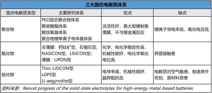 電解質(zhì)是鋰離子傳輸?shù)闹匾浇椋瑢?duì)電池性能至關(guān)重要。目前,市場(chǎng)上主流的固態(tài)電池按電解質(zhì)的不同可分為三種類型:聚合物、硫化物和氧化物。基于不同技術(shù)體系的固態(tài)電解質(zhì)材料,各具優(yōu)勢(shì)和挑戰(zhàn)。