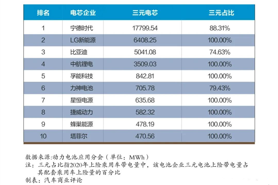 在三元鋰電領(lǐng)域,寧德時(shí)代以17799.54MWh的帶電量位居國(guó)內(nèi)第一。LG化學(xué)憑借配套國(guó)產(chǎn)特斯拉Model 3/Y,以6408.25MWh的帶電量位居中國(guó)市場(chǎng)裝機(jī)量排名第二,比亞迪則以5041.08MWh的帶電量位居第三。