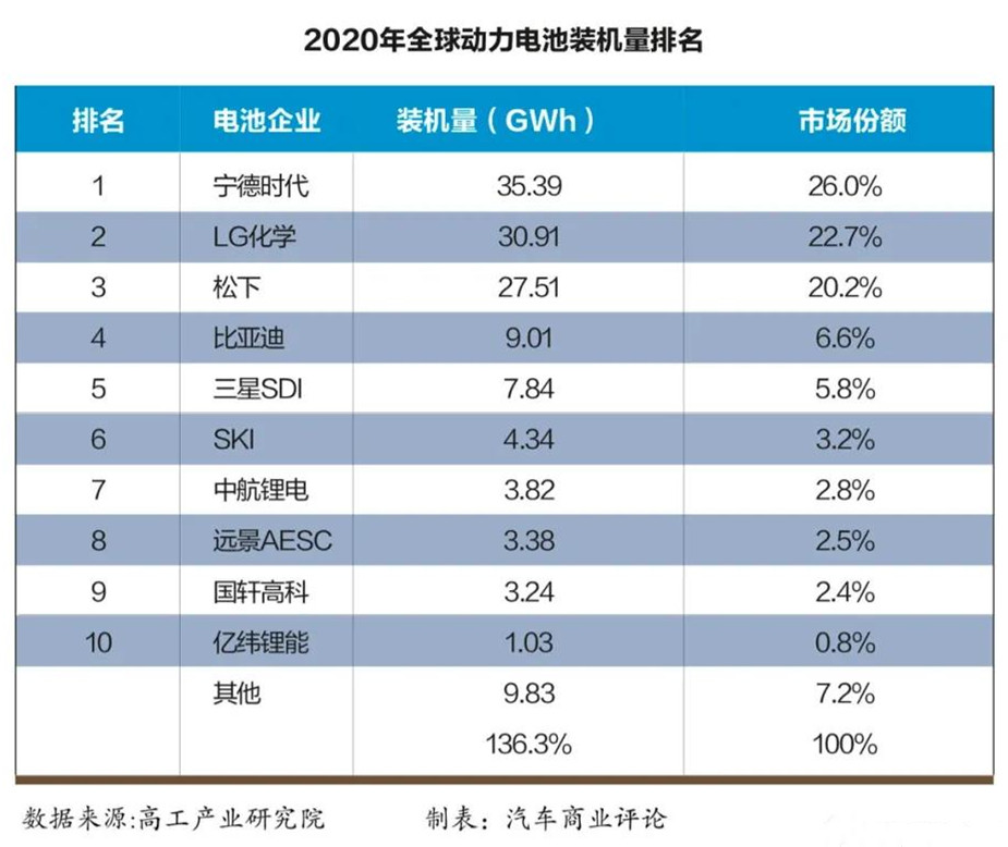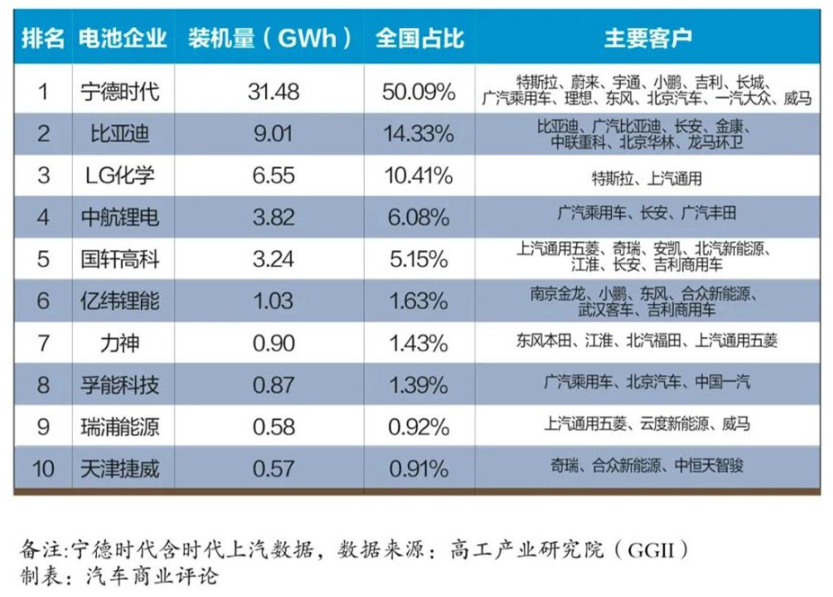 前三甲為寧德時(shí)代(31.48GWh),比亞迪(9.01GWh),LG化學(xué)(6.55GWh),所占份額分別為50.09%、14.33%、10.41%。