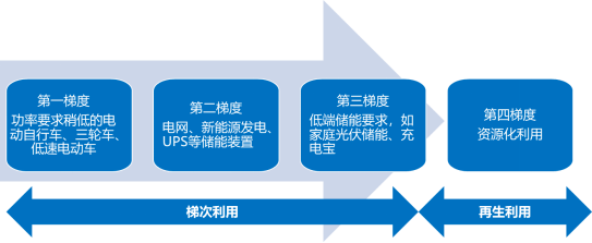 梯次利用是讓退役的動力電池應用于其他領域。動力電池實際容量降低到原來的80% 后,雖然不再適用于汽車,但卻依然可用于動力和續(xù)航需求較弱的低速電動車、通信基站和儲能設備等。