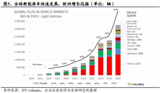 外部環(huán)境來看,全球主要經(jīng)濟體對新能源車產(chǎn)業(yè)不斷施以強有力的政策刺激;產(chǎn)業(yè)鏈來看,傳統(tǒng)車廠強勢布局,造車新勢力日漸成熟,新能源車技術不斷完善。多重因素推動下,全球新能源乘用車銷量快速增長,其中,中國為最大市場,歐洲地區(qū)憑借強有力的政策刺激,近兩年增長迅猛。
