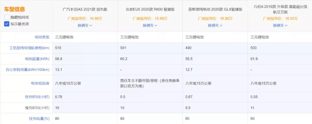 《電動(dòng)汽車觀察家》從汽車之家隨機(jī)選了幾款500公里左右的轎車進(jìn)行對(duì)比發(fā)現(xiàn),500公里的車輛電池容量大概都在60度電左右,廣汽豐田iA5不到60度電的容量,就能夠有510公里的續(xù)駛里程。