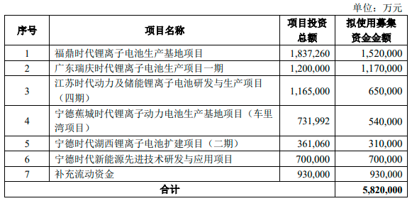 8月12日,寧德時代披露定增方案,擬募集資金總額不超過582億元,在扣除發(fā)行費用后擬投資新增鋰離子電池年產(chǎn)能約60GWh的福鼎時代鋰離子電池生產(chǎn)基地項目、新增鋰離子電池年產(chǎn)能約30GWh的廣東瑞慶時代鋰離子電池生產(chǎn)項目一期以及開展新一代動力及儲能電池關(guān)鍵材料體系研發(fā)、鈉離子電池產(chǎn)業(yè)鏈關(guān)鍵材料及設(shè)備開發(fā)等業(yè)務(wù)的寧德時代新能源先進技術(shù)研發(fā)與應用項目等6個項目及補充流動資金。具體如下: