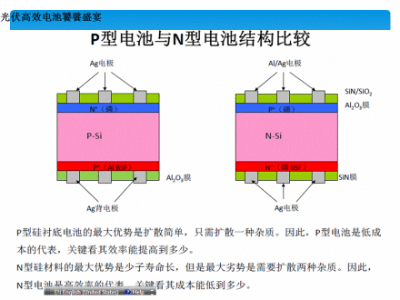 根據(jù)原材料硅片和制備技術(shù)的不同,光伏電池總體上分為P型電池和N型電池兩種P型電池只需要擴(kuò)散一種雜質(zhì),成本較低,但少子壽命短,轉(zhuǎn)化效率較低。N型電池少子壽命長(zhǎng),轉(zhuǎn)化效率高,難點(diǎn)在于需要擴(kuò)散兩種雜質(zhì),成本較高。電池發(fā)展前期受成本因素影響,大多進(jìn)行P型電池生產(chǎn),但P型電池在轉(zhuǎn)換效率達(dá)到 22.5%后,即面臨資本及技術(shù)投入邊際效益率遞減效應(yīng),轉(zhuǎn)換效率難再有效增加的問題。而N型電池具有更高的效率和無衰減特性,P型電池一直在增長(zhǎng)轉(zhuǎn)換效率,N型將成為下一代電池技術(shù)的發(fā)展方向N型電池原材料為N型硅片,N型電池具有轉(zhuǎn)換效率高、雙面率高、溫度系數(shù)低無光衰弱光效應(yīng)好載流子壽命更長(zhǎng)等優(yōu)點(diǎn),主要制備技術(shù)包括PERT、TOPCon、IBC、HJT等。