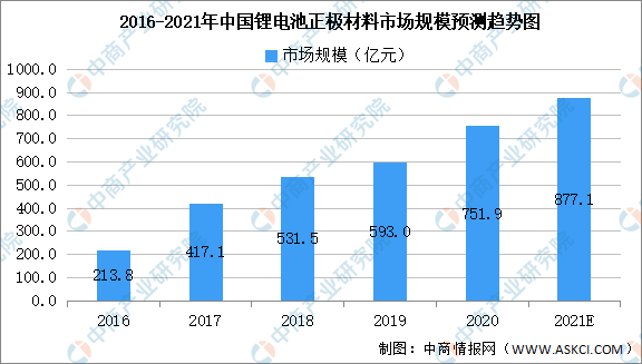 數(shù)據(jù)顯示,我國鋰電池正極材料市場規(guī)模由2016年213.8億元增至2020年751.9億元,年均復(fù)合增長率為36.9%。中商產(chǎn)業(yè)研究院預(yù)測,2021年我國正極材料市場規(guī)?蛇_877.1億元。