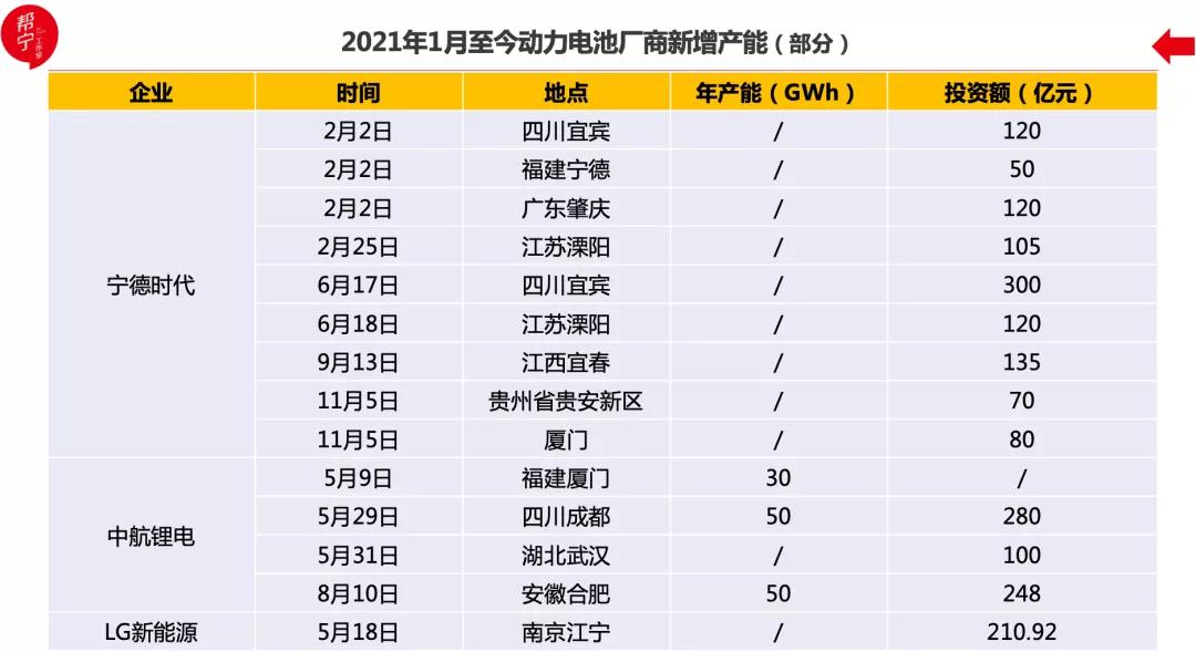 這僅僅是以寧德時(shí)代為代表的動(dòng)力電池企業(yè)產(chǎn)能擴(kuò)張的小部分。統(tǒng)計(jì)數(shù)字顯示,今年以來,比亞迪、中航鋰電、國軒高科、億緯鋰能、蜂巢能源等動(dòng)力電池企業(yè)宣布電池?cái)U(kuò)建項(xiàng)目近30次,合計(jì)投入資金超3000億元,預(yù)計(jì)新建產(chǎn)能1000GWh,約為今年裝車量的10倍。
