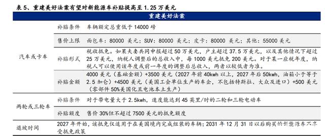 美國多舉措并行,補貼政策加大支持力度,新能源補貼金額上限由 7500 美元提 高至 1.25 萬美元。美國現(xiàn)行的補貼政策于 2009 年通過,2010 年開始實行。在聯(lián) 邦層面,根據(jù)電池容量的不同,補貼額度在 2500 美元-7500 美元,補貼形式為稅 收抵免,即消費者可在額度內(nèi)抵扣當(dāng)年應(yīng)繳納的聯(lián)邦稅,在現(xiàn)行政策下銷量達到 20 萬輛將觸發(fā)的退坡機制。而根據(jù)最新通過的議案,美國有望將對新能源車的補 貼上限提至 1.25 萬美元。在眾議院通過的重建美好法案(Build Back Better Act) 中,補貼提升為 4000 美元(基礎(chǔ)金額)+3500 美元(2027 年前 40KWh 以上,2027 年后 50KWh)+4500 美元(美國工會單位生產(chǎn)的車企,不包括特斯拉、大眾及進口) +500 美元(零部件 50%美國化且電池本土生產(chǎn)),同時提案取消了 20 萬輛的補貼 上限限制。2021 年 11 月 16 日,美國總統(tǒng)拜登簽署 1.2 萬億美元基建計劃,其中 75 億美元用于包括充電站在內(nèi)的電動車基礎(chǔ)建設(shè)。