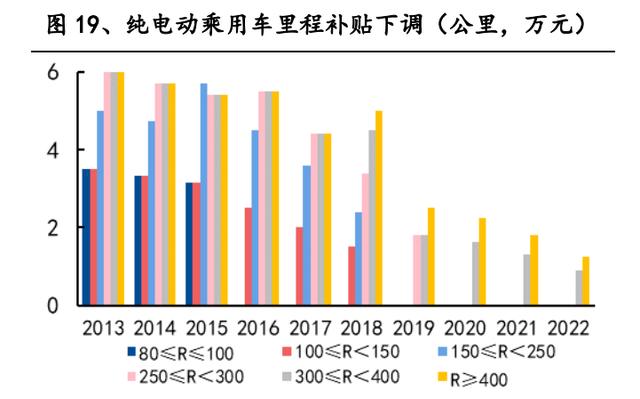 國內(nèi)新能源車補貼政策平穩(wěn)過度,補貼力度逐漸減小,市場轉(zhuǎn)向用戶的產(chǎn)品需求 驅(qū)動。政府針對新能源汽車的補貼政策是新能源汽車加速發(fā)展的重要驅(qū)動之一, 而隨著補貼政策帶動的新能源汽車市場蓬勃發(fā)展,補貼政策逐漸退坡,市場由政 策驅(qū)動平穩(wěn)轉(zhuǎn)向用戶的產(chǎn)品需求驅(qū)動。2010 年,為有效緩解能源和環(huán)境的壓力, 加快汽車產(chǎn)業(yè)轉(zhuǎn)型升級,國家發(fā)布了《關(guān)于開展私人購買新能源汽車補貼試點的 通知》,有關(guān)個人的新能源汽車補貼政策就此拉開序幕。2013,適用城市名單從試 點的 5 個城市擴增至全國 88 個城市,新能源汽車產(chǎn)銷規(guī)模呈爆發(fā)式增長。2014 年 2 月,鑒于推廣工作進展順利,政策效果良好,國家財政部發(fā)布通知對新能源 汽車的補貼標(biāo)準進行調(diào)整,2014 年在 2013 年標(biāo)準基礎(chǔ)上退坡 5%,2015 年在 2013 年標(biāo)準基礎(chǔ)上退坡 10%。2016 年起,補貼政策進入調(diào)整期,補貼邏輯由“面面俱 到”轉(zhuǎn)為“扶優(yōu)扶強”,補貼門檻全面提高,補貼退坡加速。2017 年補貼政策引 入能量密度衡量指標(biāo),引導(dǎo)行業(yè)進行技術(shù)升級,2017-2018 年補貼標(biāo)準在 2016 年 基礎(chǔ)上退坡 20%,2019 年補貼標(biāo)準在 2018 年基礎(chǔ)上退坡 50%,原預(yù)計 2020 年底 退坡到位。然而,受疫情、經(jīng)濟等因素的影響,2020 年財政部等四部委再次發(fā)文 延長補貼期限,平緩補貼退坡力度和節(jié)奏,2020-2022 年補貼標(biāo)準分別在上一年 基礎(chǔ)上退坡 10%、20%、30%。具體到車型來看,國內(nèi)主流車型的國補退坡金額在 2000-5400 元不等,以續(xù)航里程大于 400km 的車型為例,非公共純電動乘用車的 里程補貼標(biāo)準從 2019 年的 2.5 萬元降至 2022 年的 1.26 萬元,降幅達 50%,補貼 政策退坡明顯。